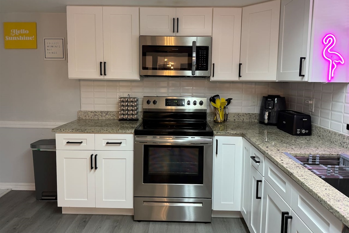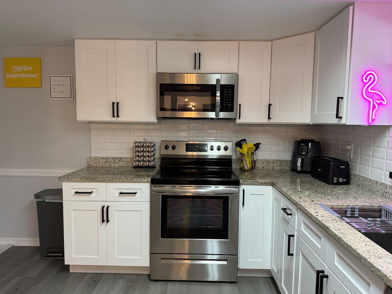 A beautiful and functional fully renovated new kitchen. Window that looks out into the pool area. Stainless steal appliances as well as many small appliances such as air fryer, strong blender, food processor. A fully stocked coffee bar with variety of coffee makers to get your engine revving in the morning.