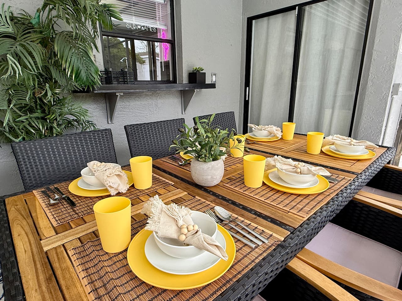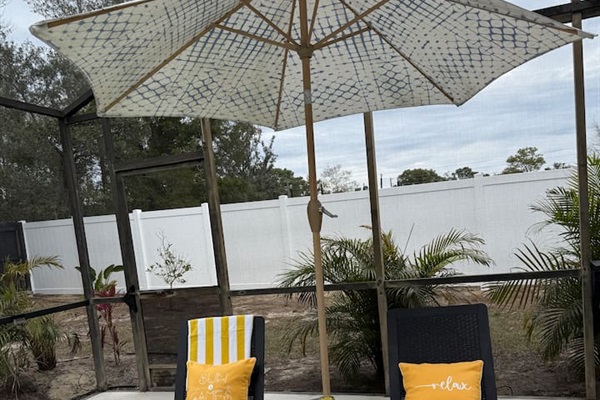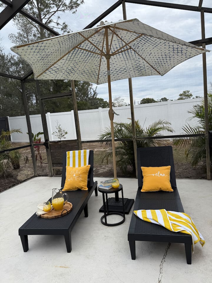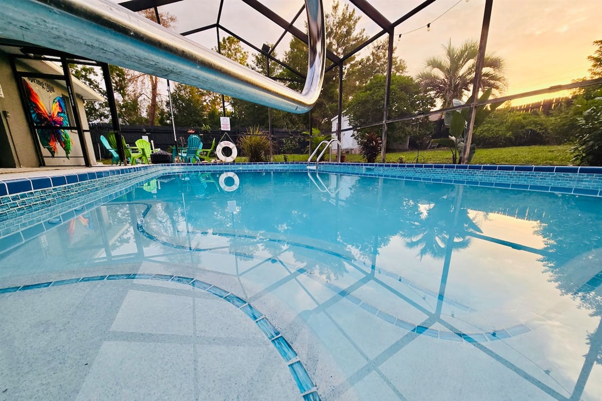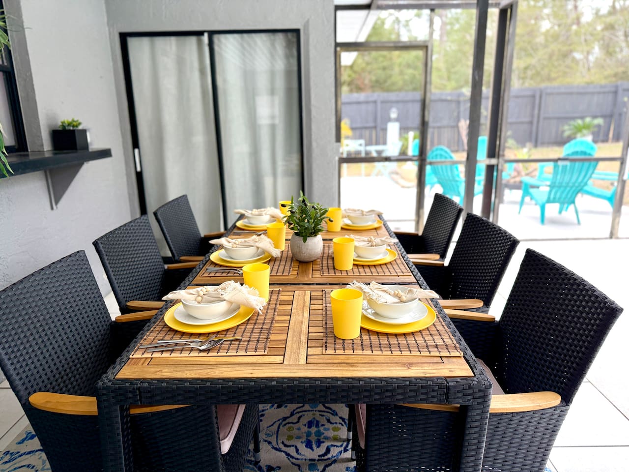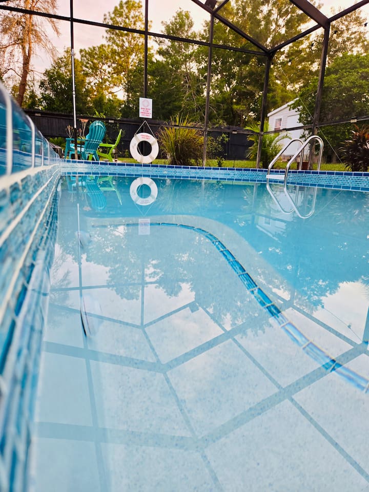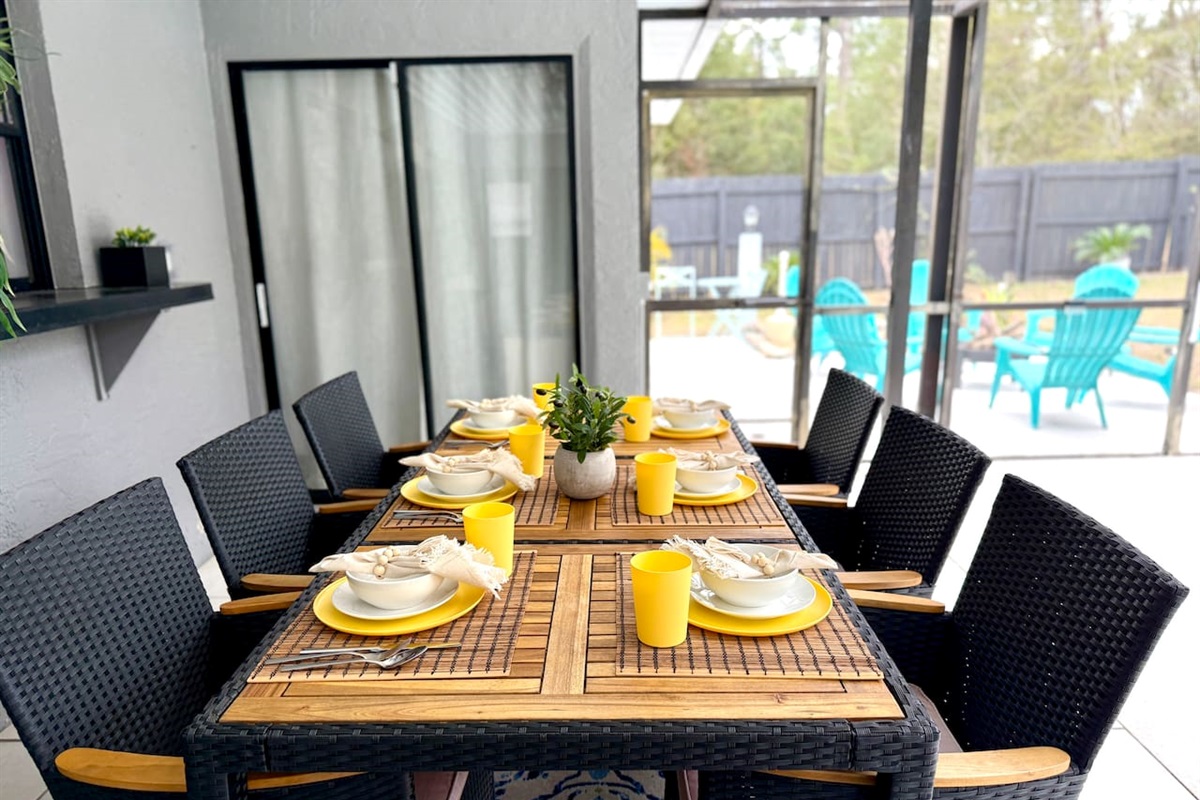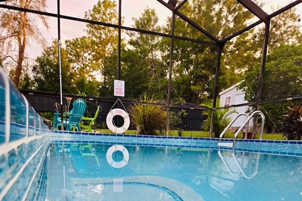 • Pool and and sitting area is all within a lanai so no need to worry about mosquitos. Large area is covered with a large table with chairs so you can dine outside as well as seating area with a fire table.